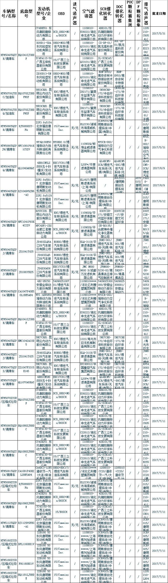 | HTW5070GJYEQ/加油車 | EQ1070SJ3BDFWXP | YN33CRE1 昆明云內動力股份有限公司 | EDC/博世汽車柴油系統(tǒng)有限公司 | / | 1109010-Z82171/襄樊東益源汽車零件有限公司 | YN38CRE-172/中自環(huán)保科技股份有限公司 | YN38CRE-171/中自環(huán)?萍脊煞萦邢薰 | / | / | 1205211-Z82181/無錫威孚力達催化凈化器有限責任公司 | 2017/5/31 |